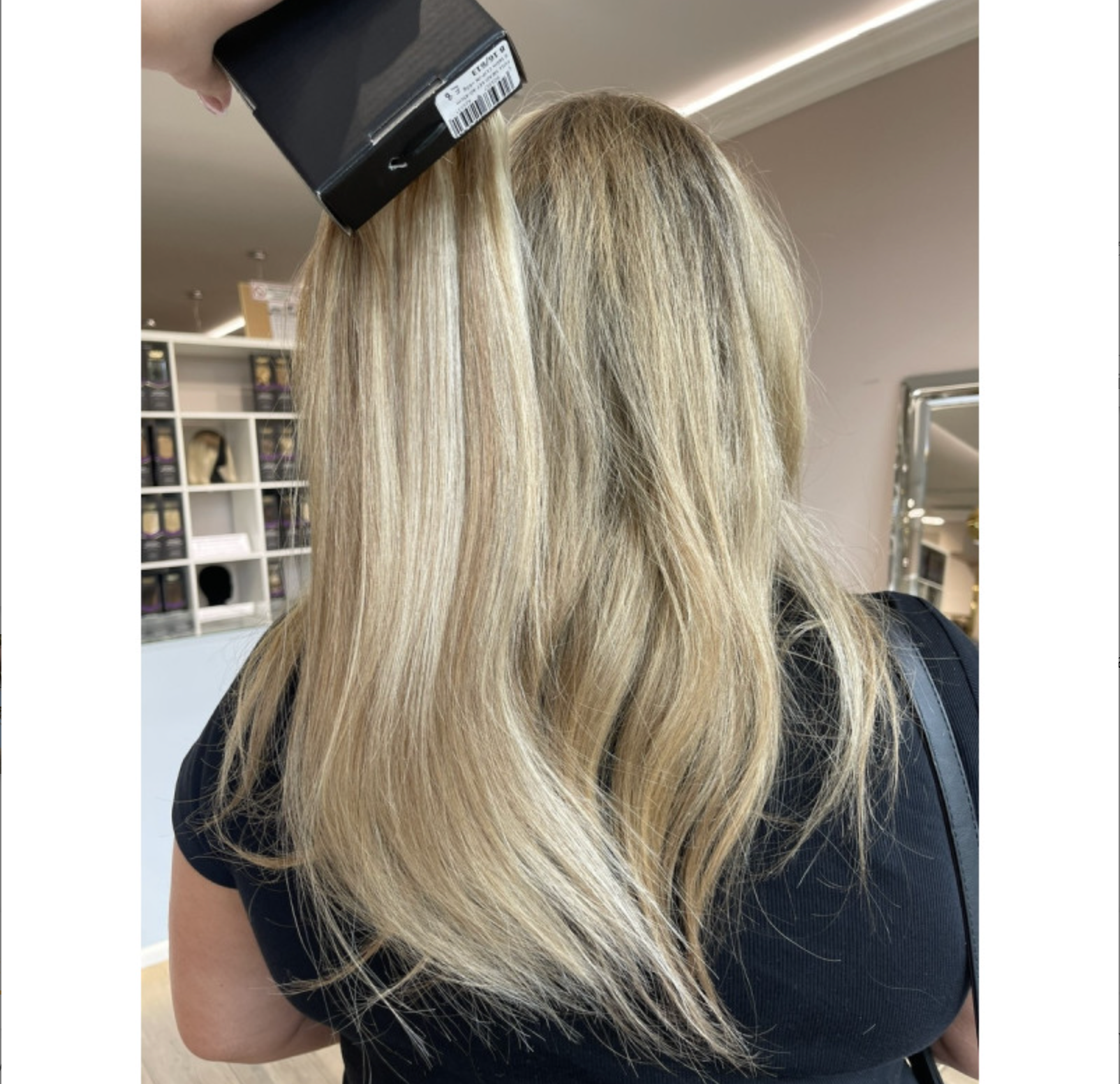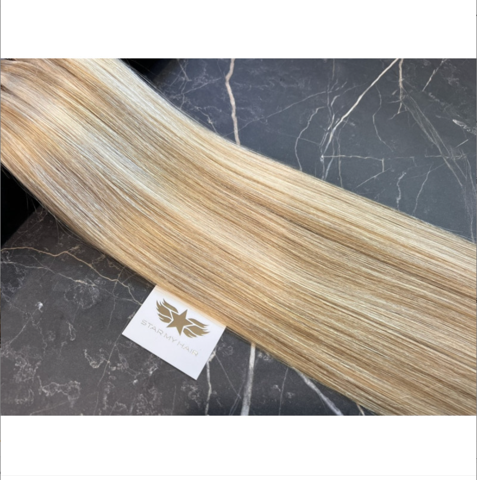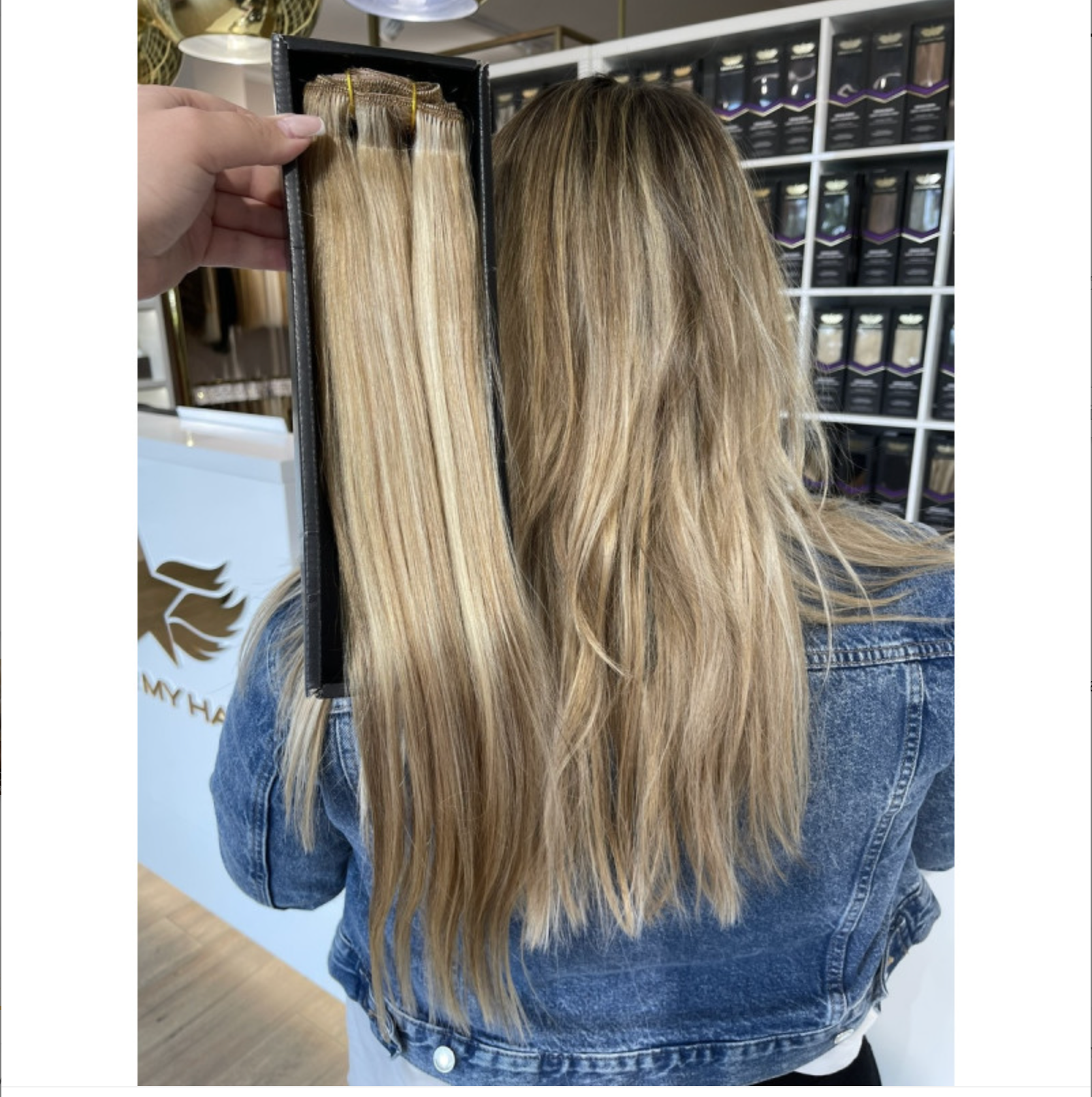 Natūralūs prisegami plaukų tresai karamelinės blondinės spalvos su šviesesnėmis sruogelėmis (Belayage dažymo technika), B 16/613 nr.
