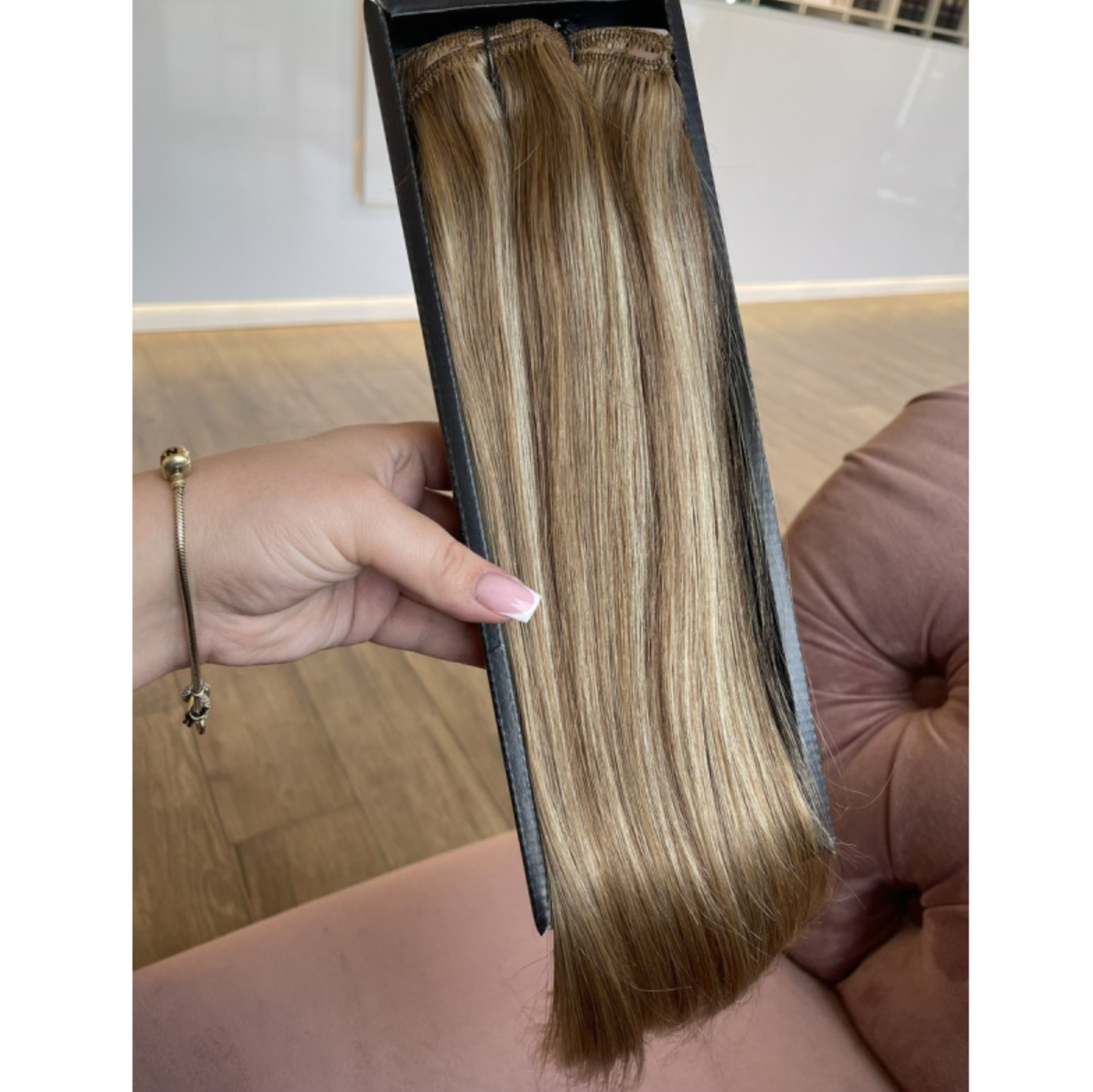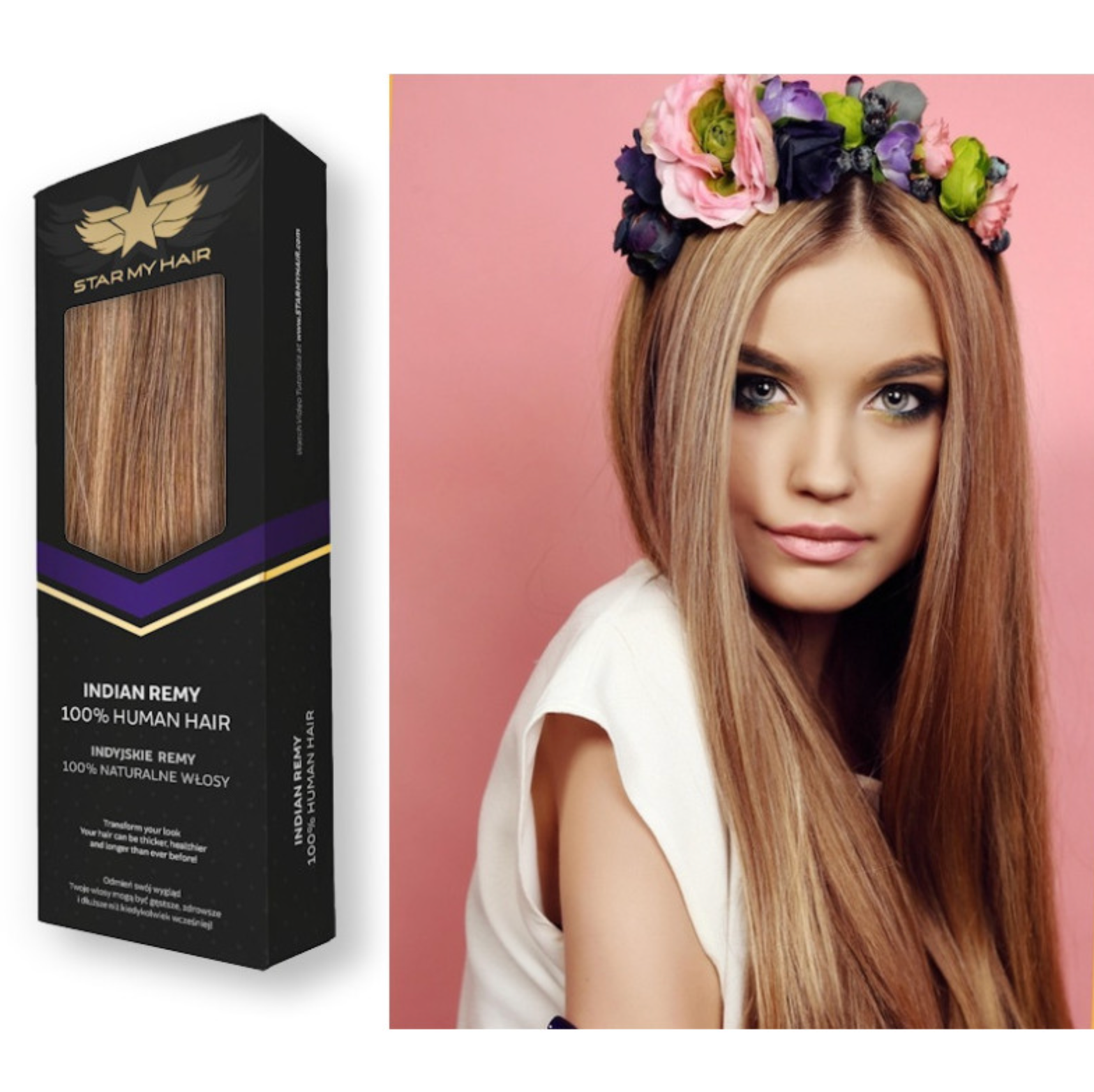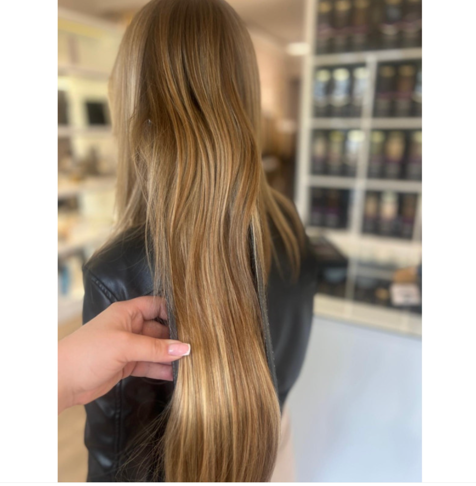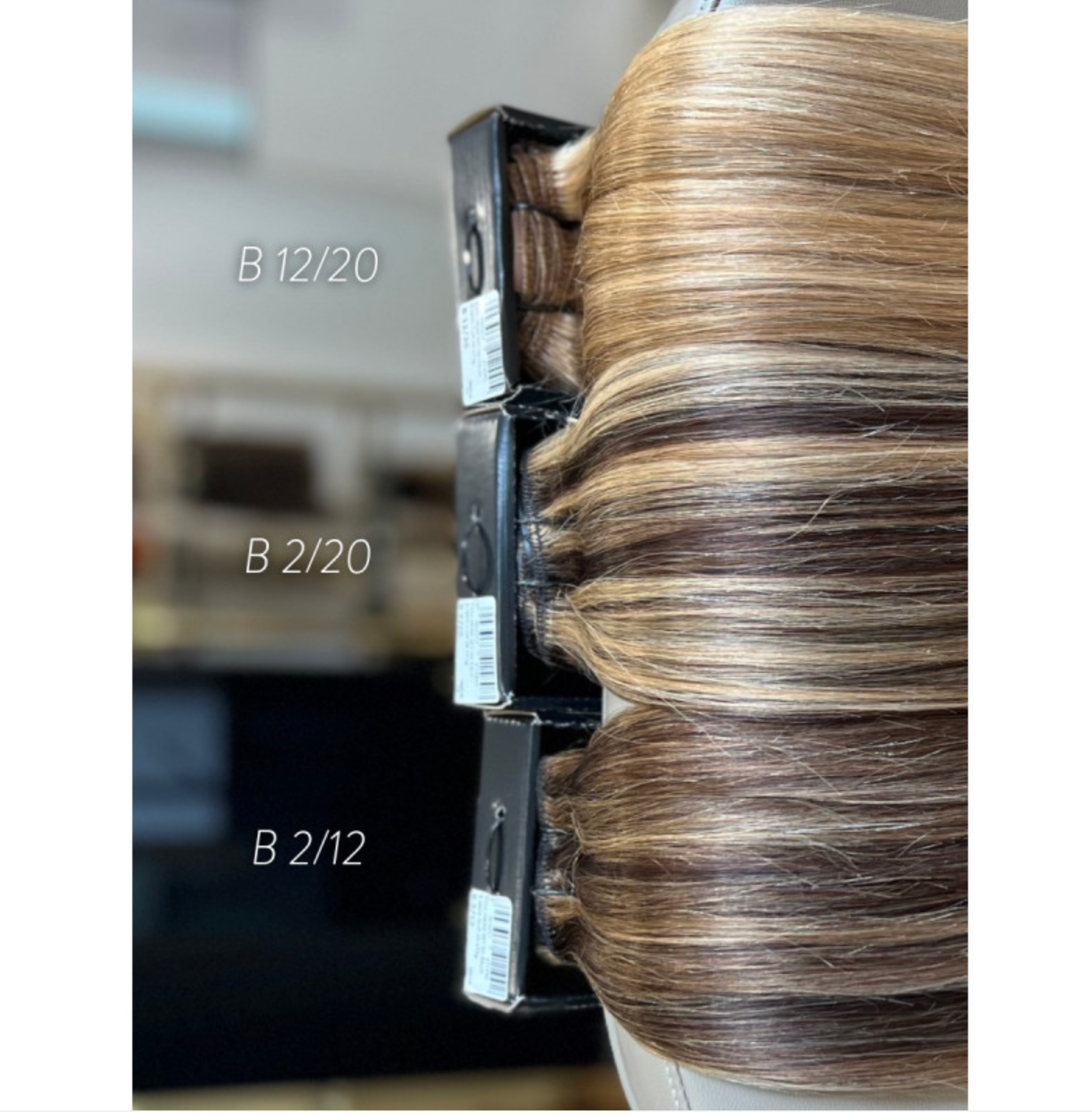 Natūralūs prisegami plaukų tresai karamelinės spalvos su šviesesnėmis sruogelėmis (Belayage dažymo technika), B 12/20 nr.