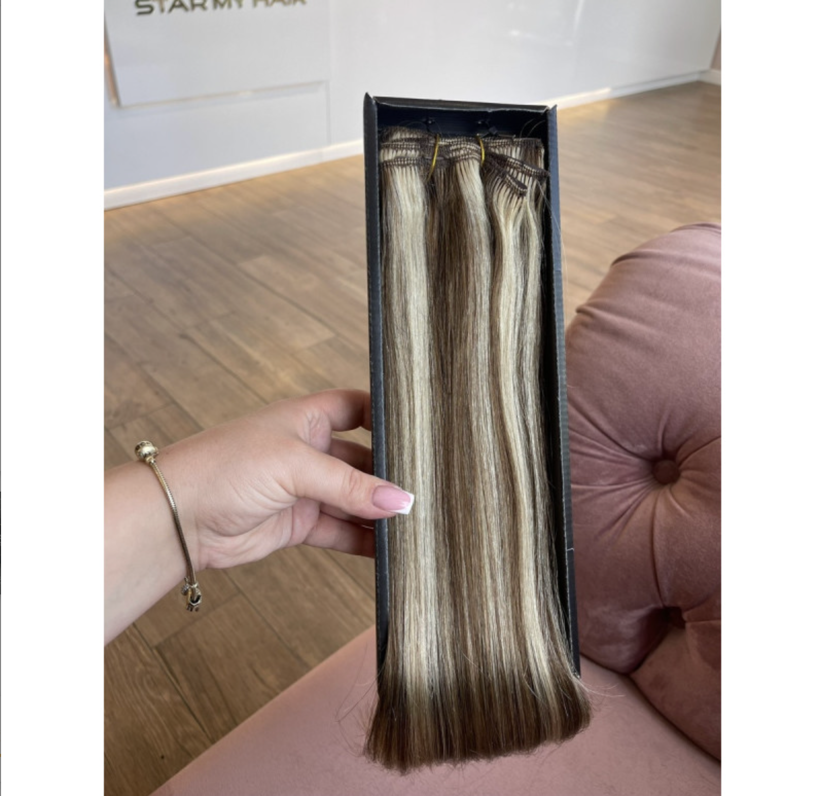 Natūralūs prisegami plaukų tresai riešutų rudos spalvos su šviesesnėmis sruogelėmis (Belayage dažymo technika), B 6/613 nr.
