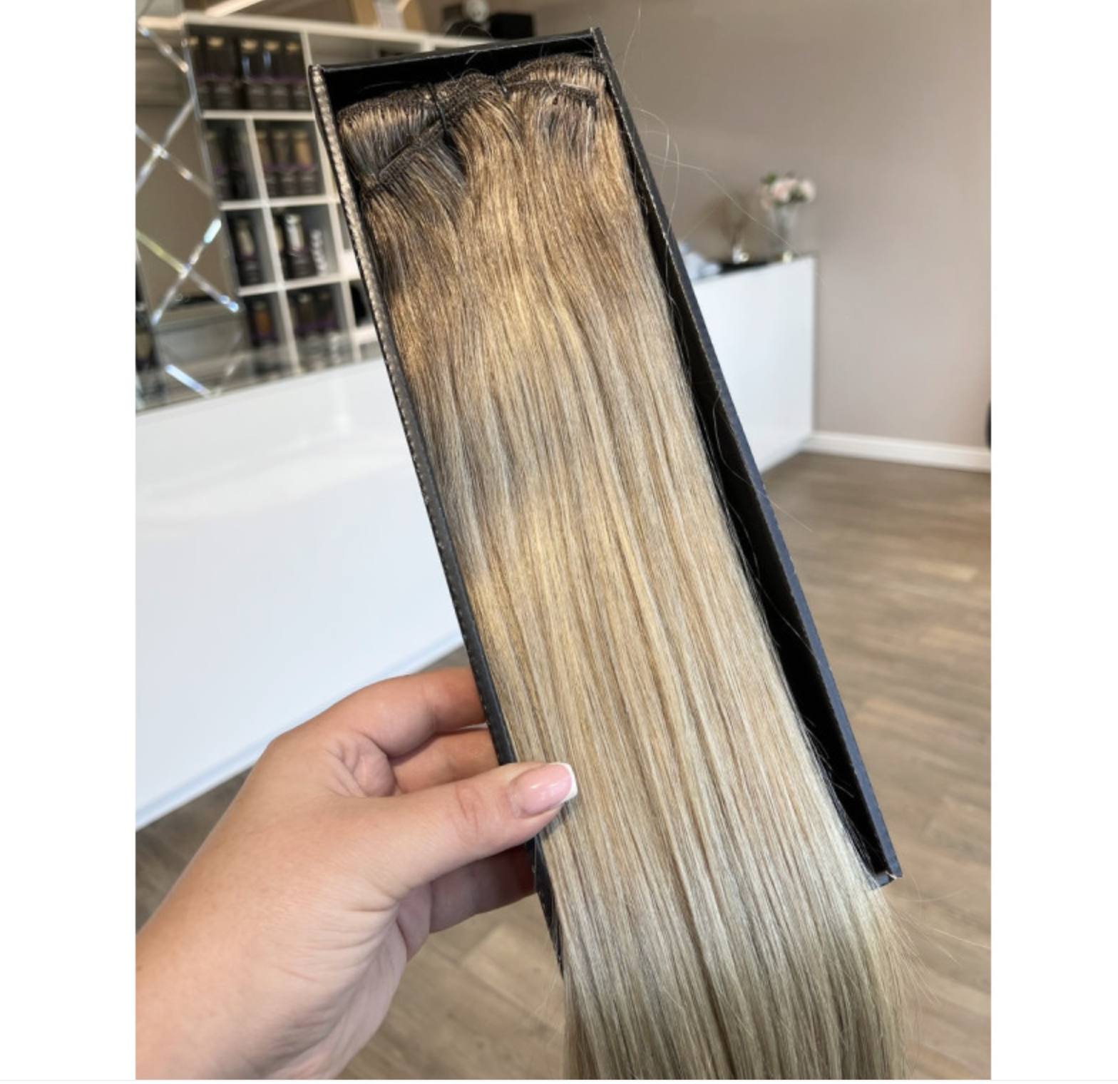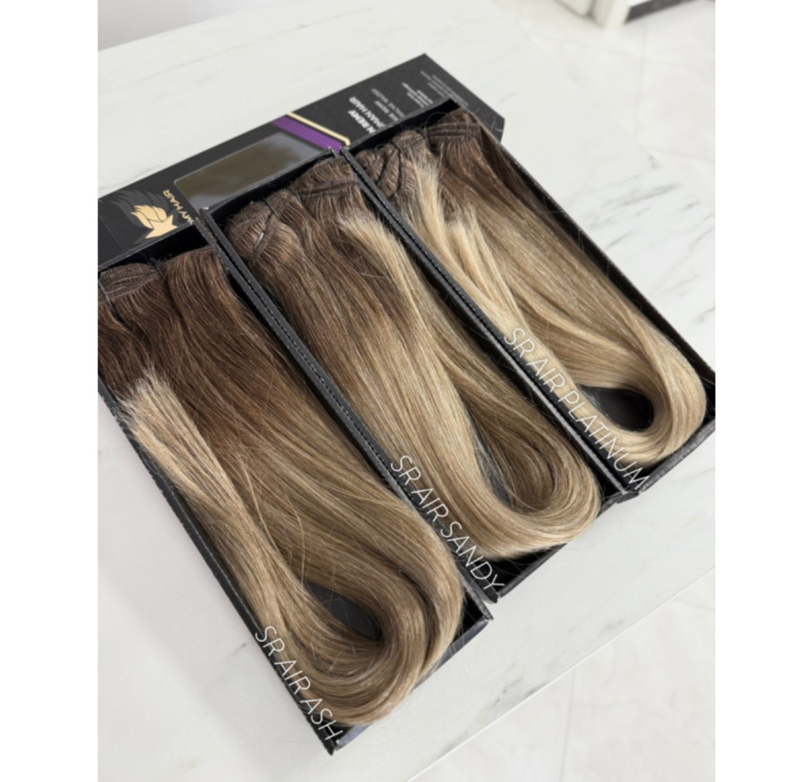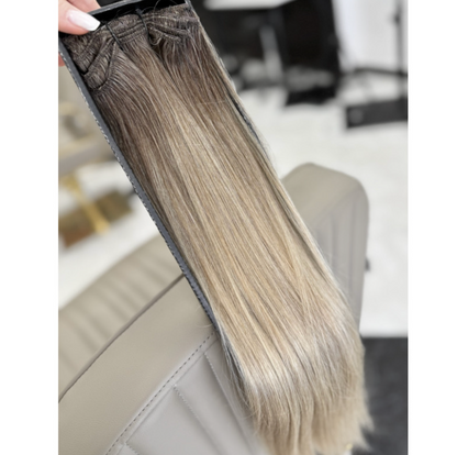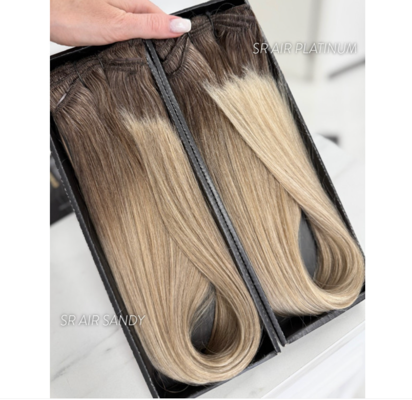 Natūralūs prisegami plaukų tresai šaltai šviesios blondinės atspalvio su tamsesnėmis šaknimis (Air Touch perėjimas), SR Air Platinum