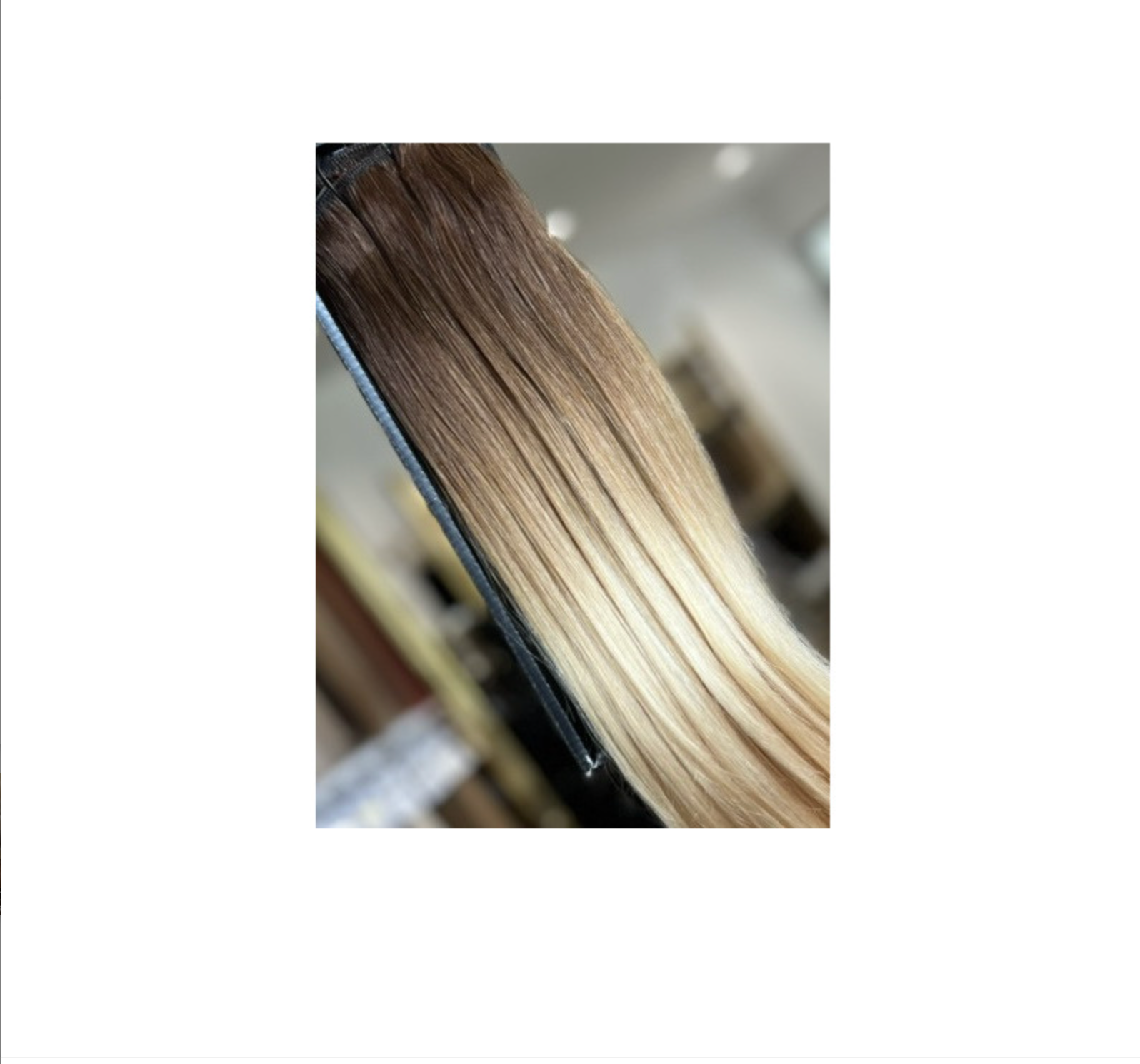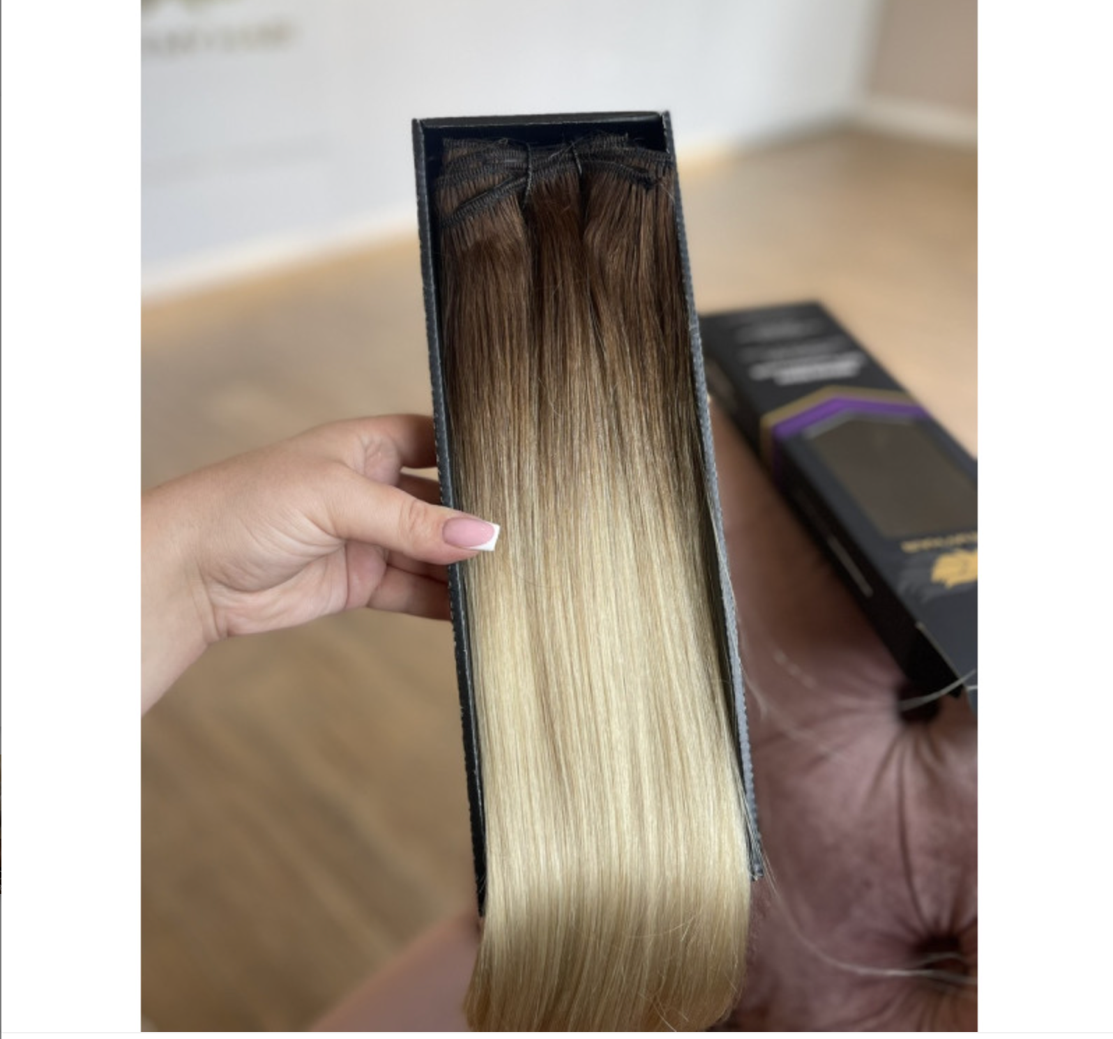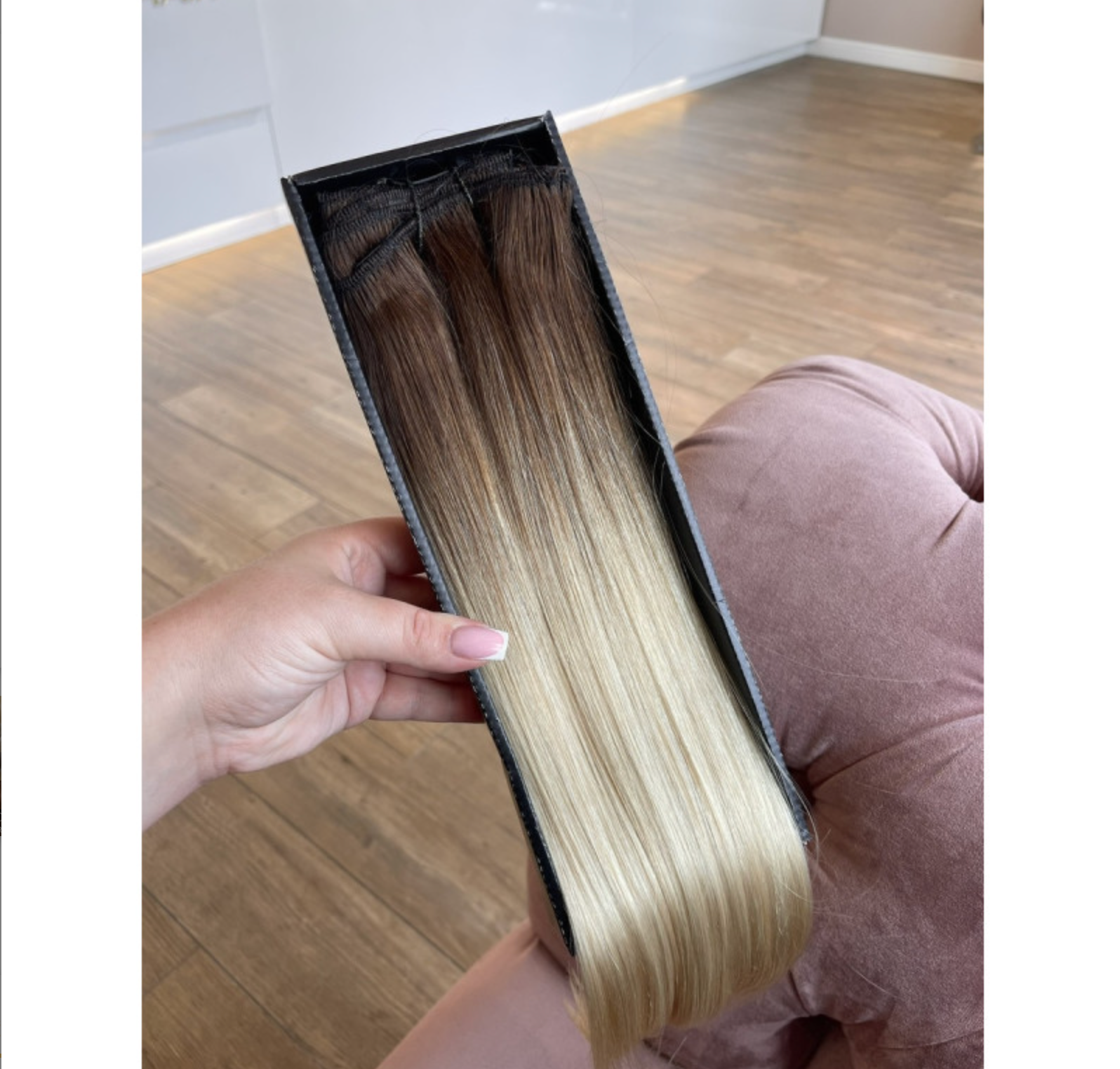 Natūralūs prisegami plaukų tresai su ombre perėjimu iš šokoladinės rudos į blondinės atspalvį, O 4-24 nr.