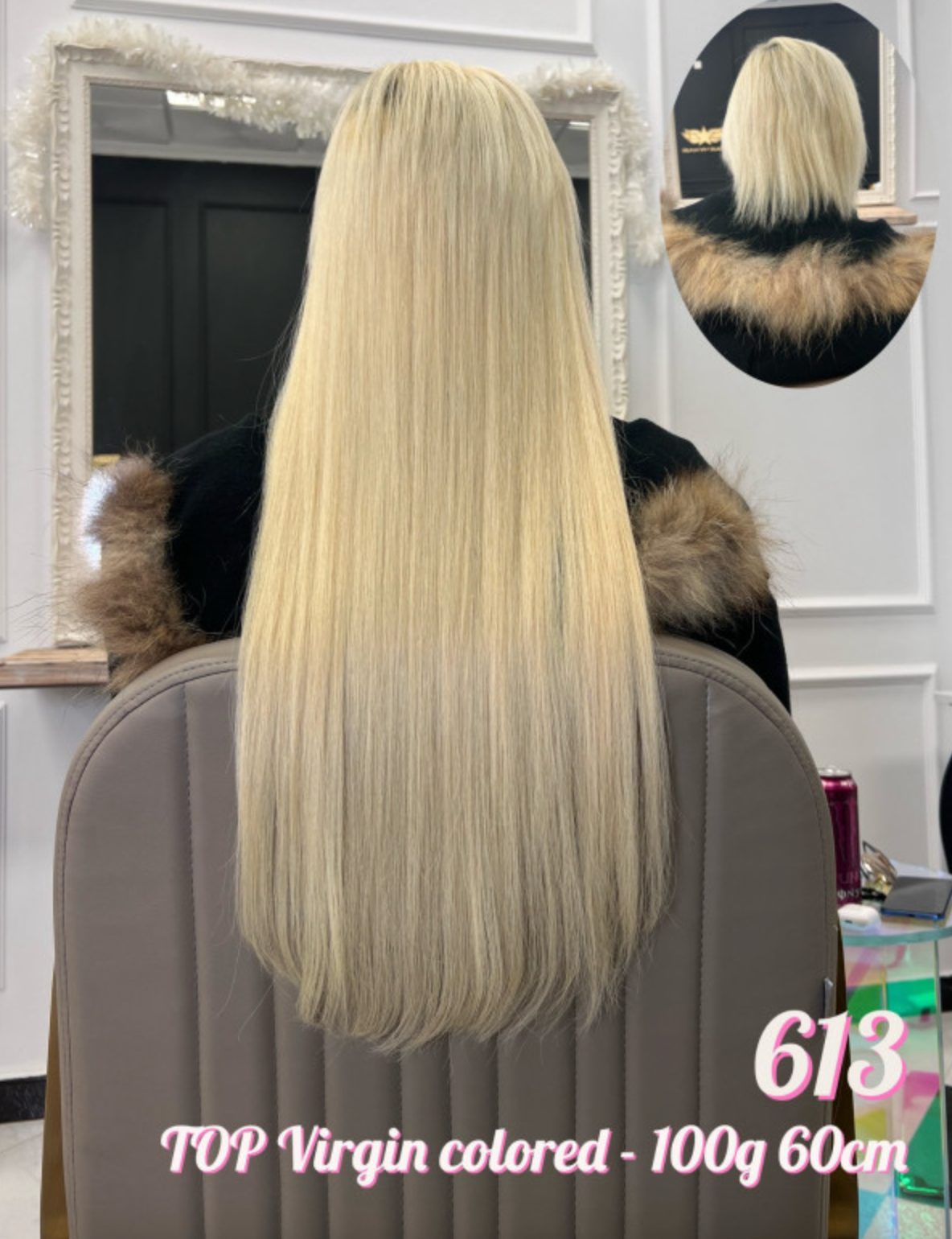 TOP Virgin Colored linija yra labai aukštos kokybės plaukai. Gaminimui naudojami tik natūralūs plaukai jaunų merginų, kurie niekada nebuvo šviesinami, dažomi ar chemiškai apdoroti – tai sveikiausi ir gražiausi plaukai. Tada, gamybos proceso metu, plaukai yra labai švelniai dažomi, naudojant specialius, švelnius dažymo produktus per kelias dienas, kad būtų išvengta plaukų struktūros pažeidimo ir kad plaukai išliktų kuo ilgiau.